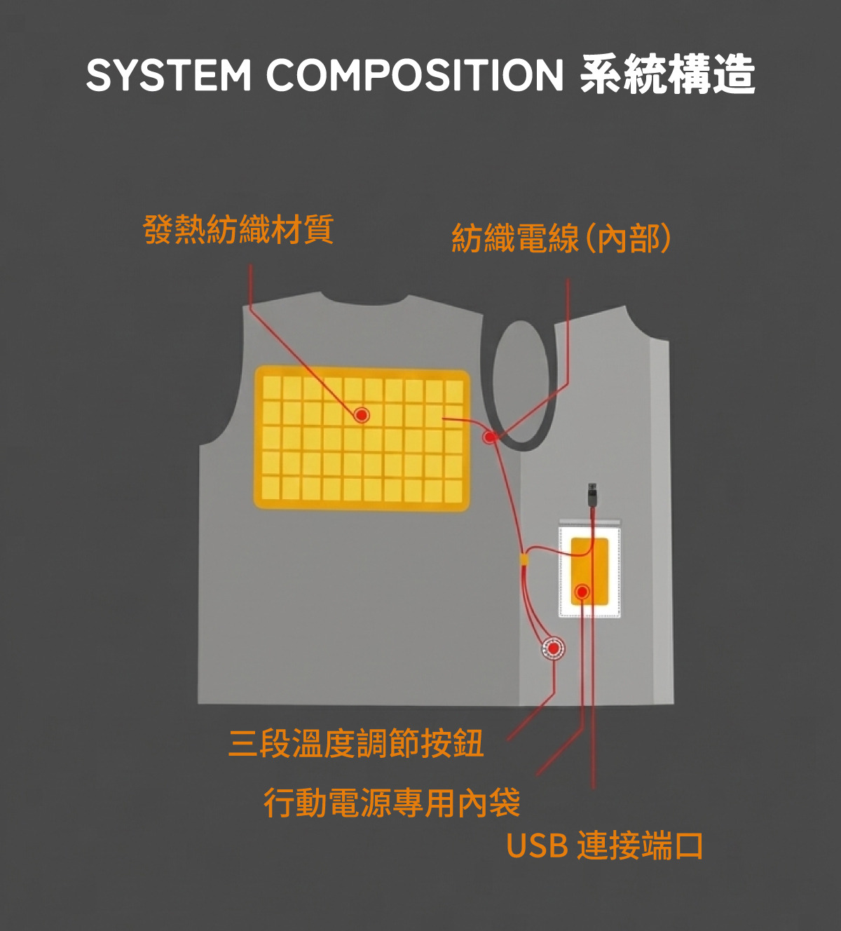 本產品為內建可水洗的發熱紡織材質於衣物內,